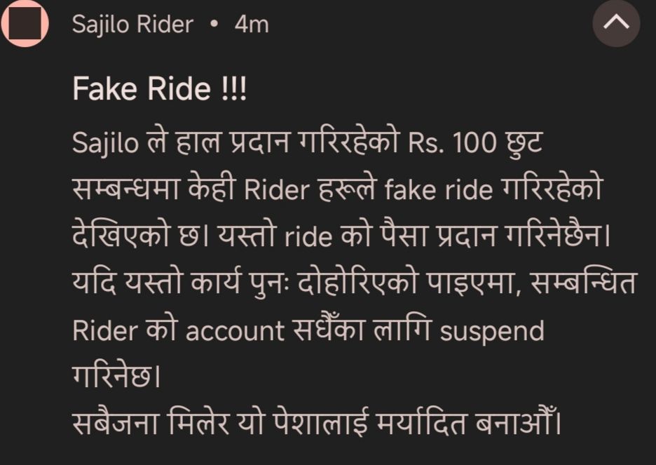 त्यही क्रममा केही राइडरहरू डिस्काउन्ट वा छुटको पैसा पाउनका लागि फेक राइड गर्न थालेको छ।  सजिलोले त्यस्ता फेक राइडहरू गरिएमा पैसा नआउने बताएको छ भने त्यस्ता फेकराइट गर्नेहरूको खाता सदाका लागि निलम्बित गरिने बताएको छ।
